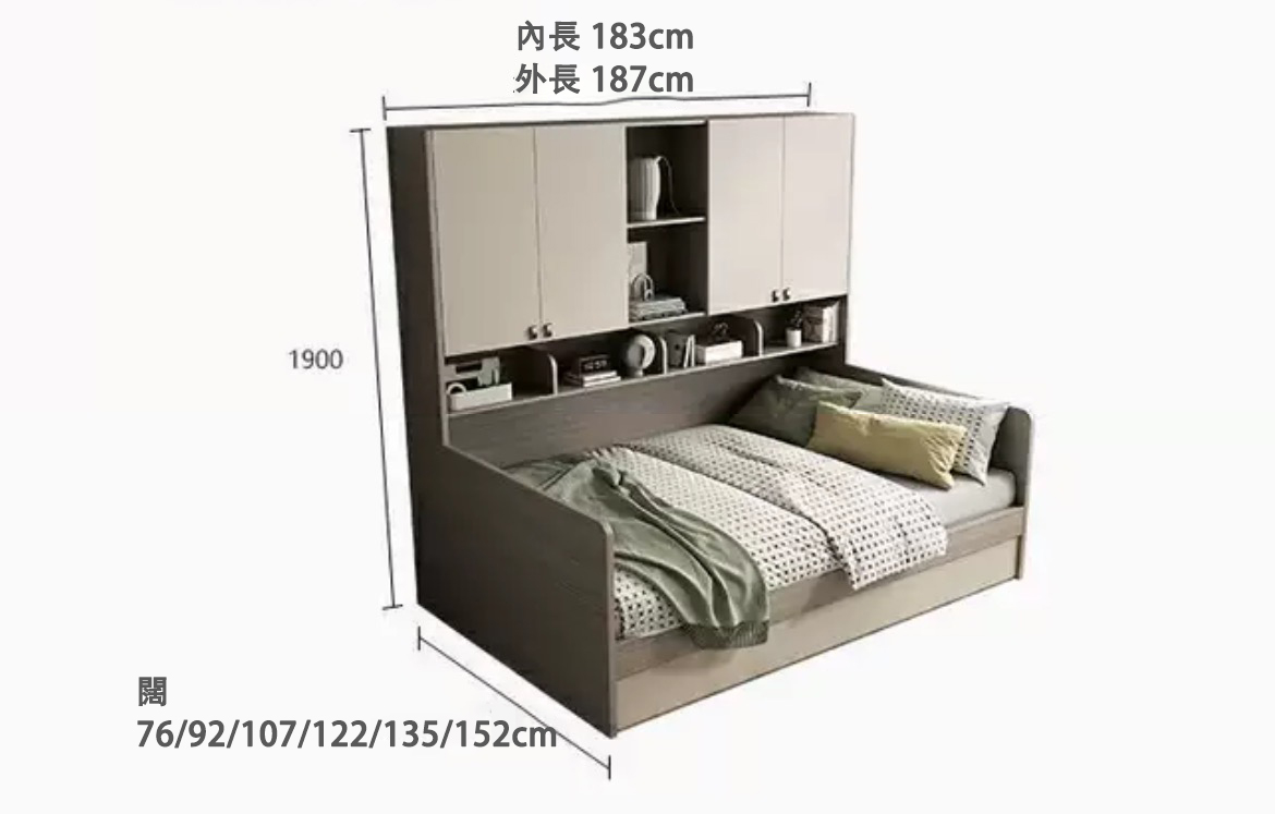 2呎半床:榻榻米外尺寸:長187*闊78/內尺寸:長183*闊76CM 衣櫃尺寸:闊187*深40cm 3呎床:榻榻米外尺寸:長187*闊94/內尺寸:長183*闊92CM 衣櫃尺寸:闊187*深40cm 3呎半床:榻榻米外尺寸:長187*闊109/內尺寸:長183*闊107CM 衣櫃尺寸:闊187*深40cm 4呎床:榻榻米外尺寸:長187*闊124/內尺寸:長183*闊122CM 衣櫃尺寸:闊187*深40cm |