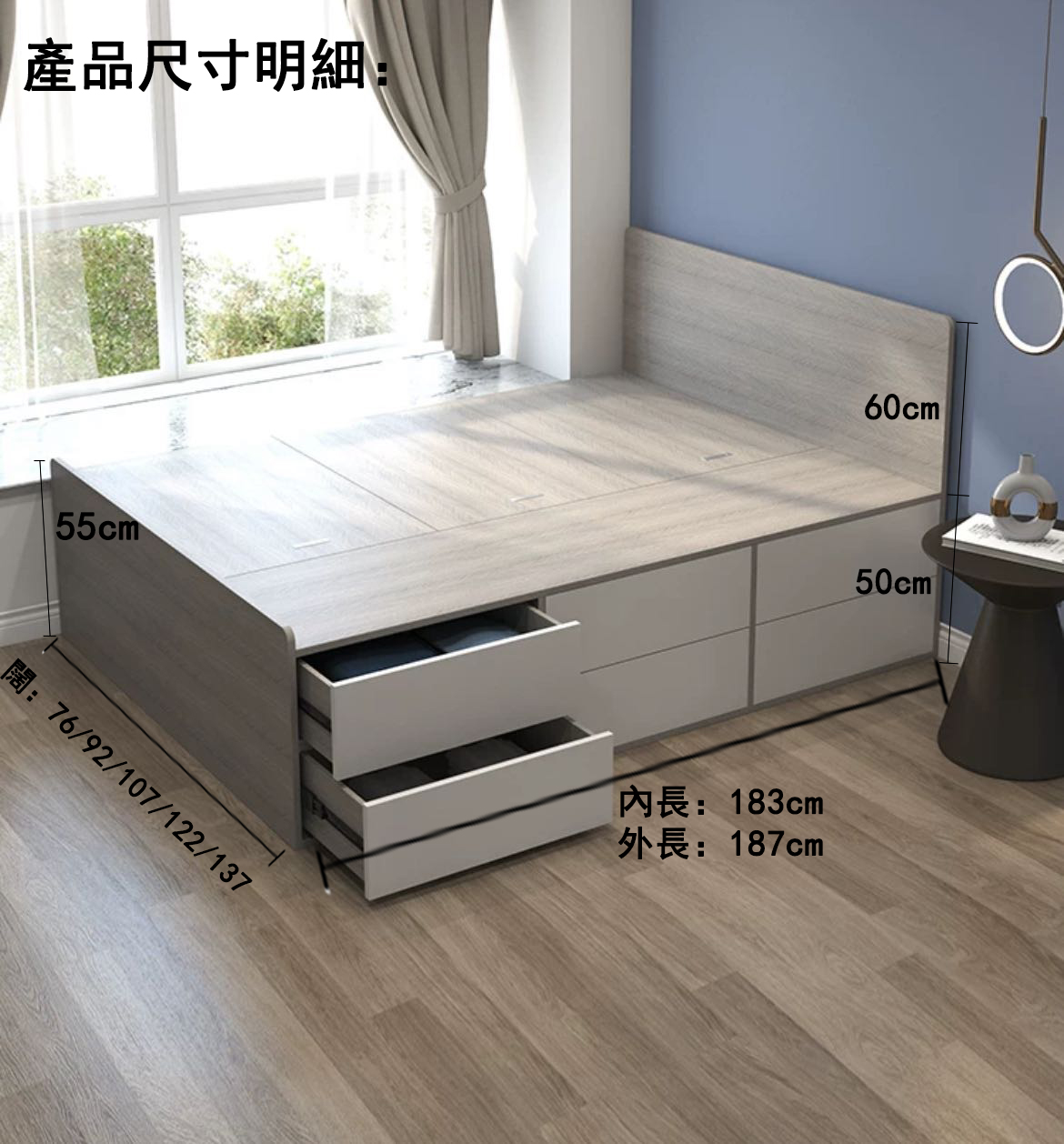 3呎半床:外尺寸:長187*闊107/放床褥尺寸:長183*闊107 4呎床:外尺寸:長187*闊122/放床褥尺寸:長183*闊122 4呎半床:外尺寸:長187*闊137/放床褥尺寸:長183*闊137 5呎床:外尺寸:長187*闊152/放床褥尺寸:長183*闊152 |