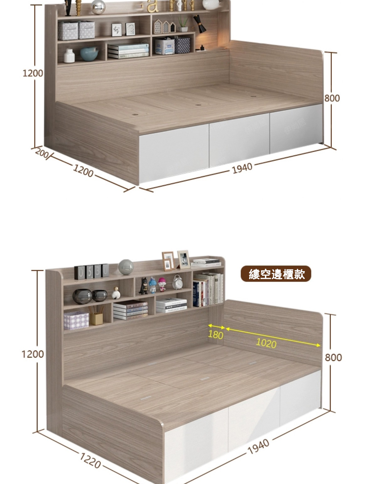 | 尺寸(闊x深x高): 單位cm:書架高度120cm,深度18cm 床標準高度40cm |