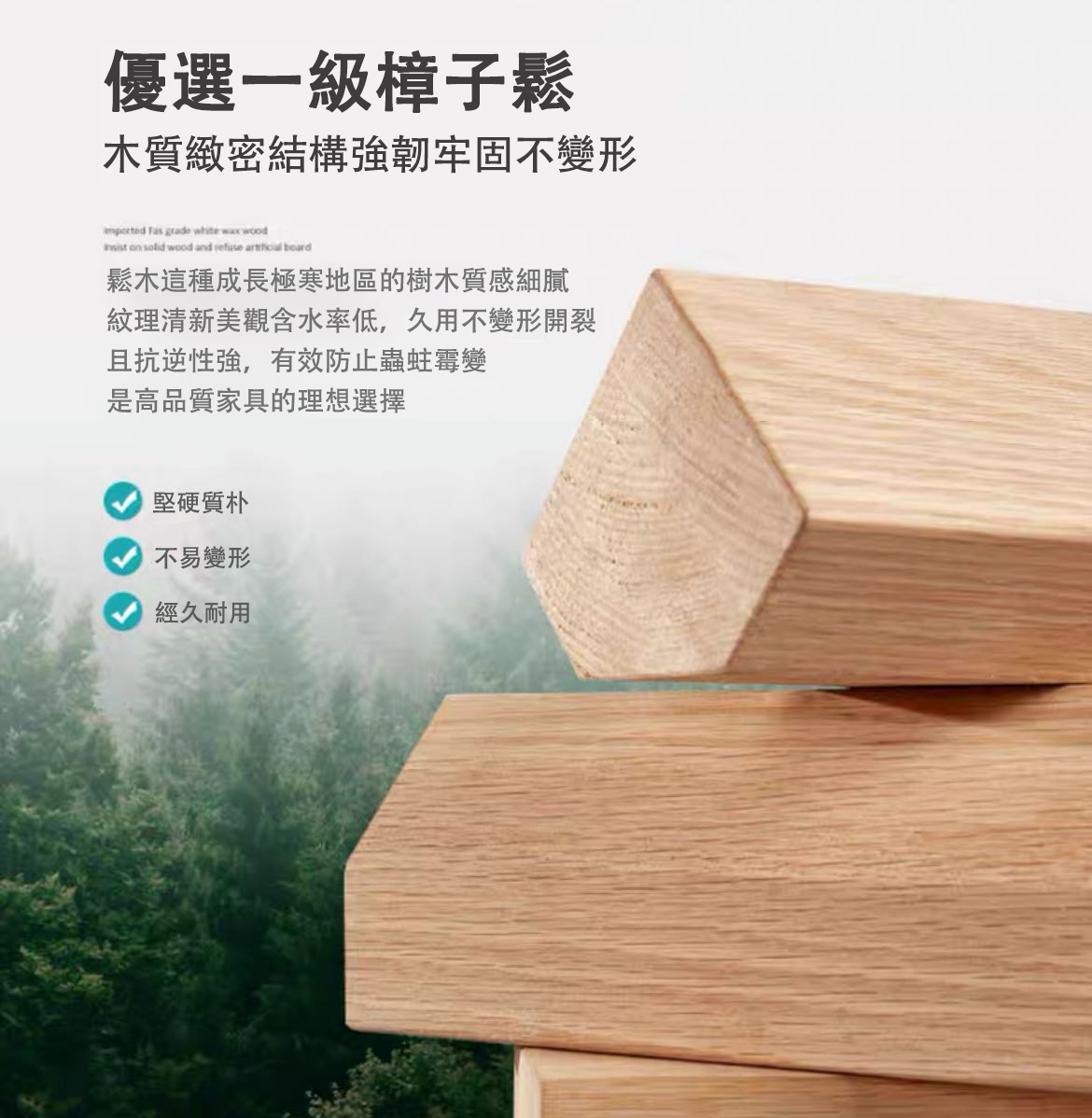 | 顏色 | 原木無漆/原木清漆/原木白色 |